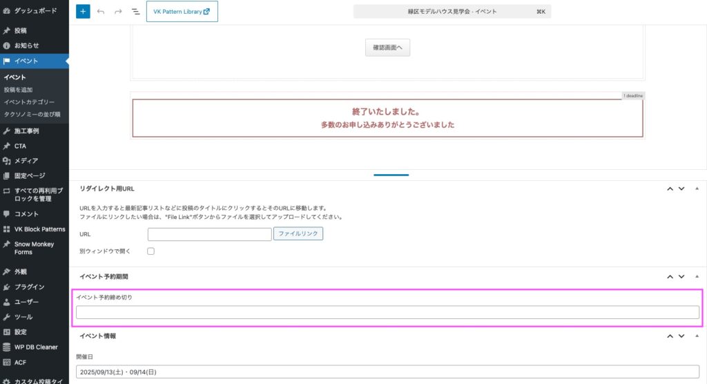 さらに、開催日・時間・場所といったイベント情報を簡単に入力できるように、カスタムフィールド(ACF)を活用。